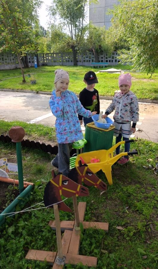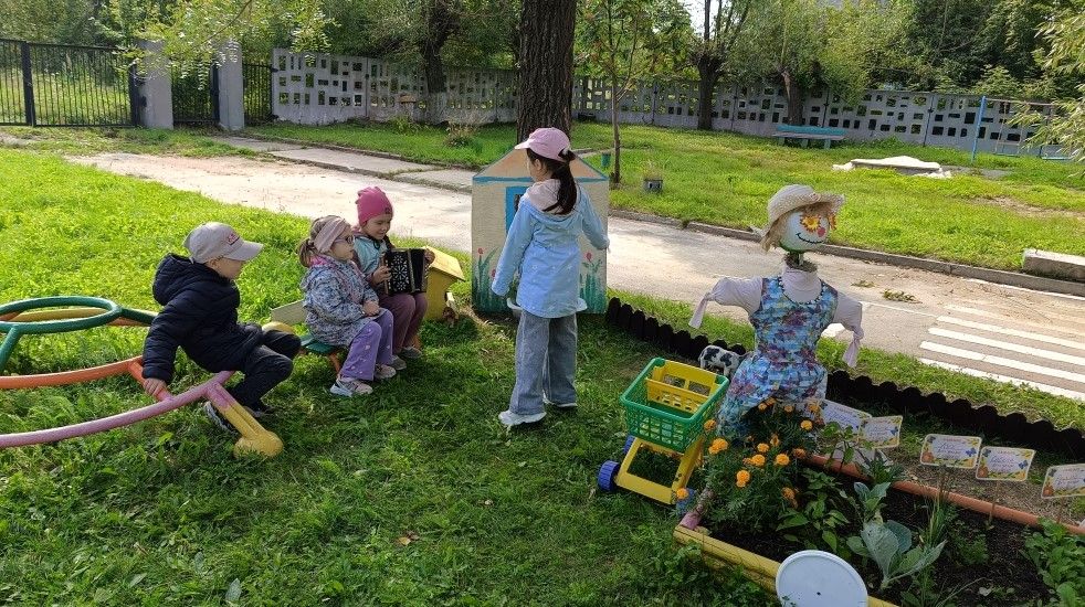 Сколько радости доставляли детям уход и наблюдение за всходами! Первоначальная задумка оформления грядки в виде тележки с лошадьми переросла в целый деревенский двор, где живёт собачка Тузик, поросёнок Цыпа, корова Мурка. Ну и какой же огород без пугала?! Его помогли сделать и установить наши родители. Получилось ярко, красочно, дети с удовольствием проводят время во дворе: поют, танцуют, играют на гармошке.